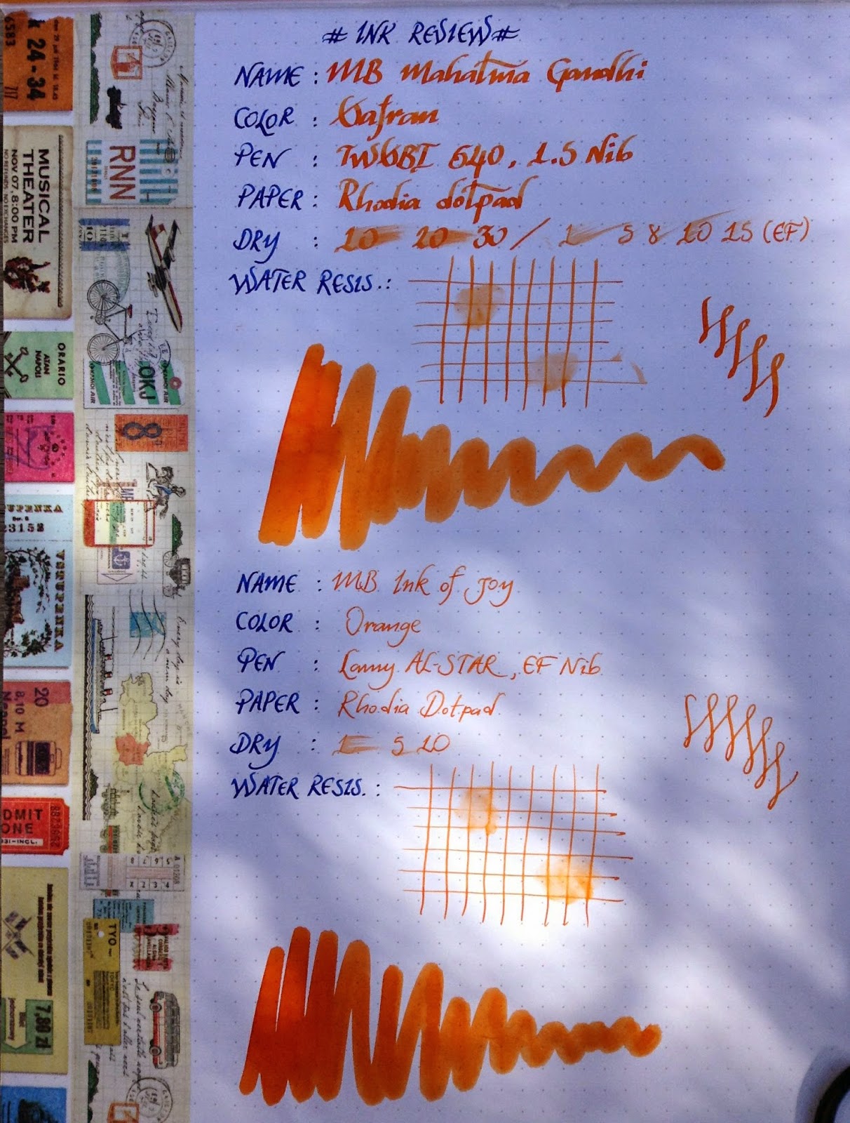 Genelde Avrupa mürekkeplerini uzak doğulu kalemlerde kullanmak adetim değildir ama TWSBI de bile ıslak bir yazımı vardı,bu yüzden 2-3 saniye daha geç kurumakta Ink Of Joy'a göre, dot padde 15 saniye üzeri, standart kağıtta ise 10 saniyede kuruyan bir yapıda bunda ki sebep dotpadlerde bütün mürekkeplerin daha geç kuruması tabi ki, Ink Of Joy'a gelecek olursak Orange olarak geçen bu renk daha kırmızı ve bakırımsı tonlar içeriyor ben daha çok kırmızı ve sıcak tonlu olan turuncuları tercih ediyorum, ikisi arasında ink of joy favorim oldu aynı zamanda kuruma hızı olarak da standart kağıtta 7 saniye de kururken görmüş olduğunuz gibi dotpad de 10 saniye civarı, her iki mürekkebi de , aynı uçlarla farklı kağıtlarda tekrar tekrar denedim sonuç bu şekilde oldu, fakat kağıtta gölgelenme sevenler için belirteyim Mahatma Gandhi daha belirgin gölgelenmeye sahip bu yönüyle de biraz GVFC mürekkeplerinin hoş yapısını hatırlattı bana.